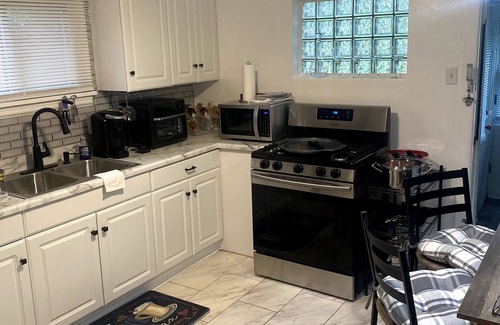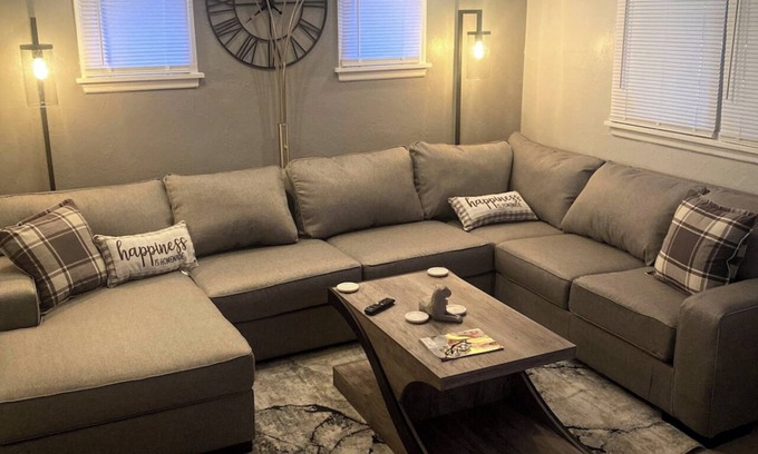 Located in safe, friendly, and diverse neighborhood, this home's Master bedroom houses a queen bed, walk-in closet, and an office area with a desk and chair. The 2nd bedroom has a double daybed a twin bed on the top and bottom, a bunk bed with a twin bed on top and a full bed below. The living room also contains a full sized sofa bed and every room has TVs excluding the bathrooms and kitchen. The full kitchen includes a dining table, refrigerator, stove/oven, microwave, air fryer, coffee maker, dishes, cups and other items that you may need. Bottled water and snacks will always be left for guests. Two work areas, both with desk and chair.
