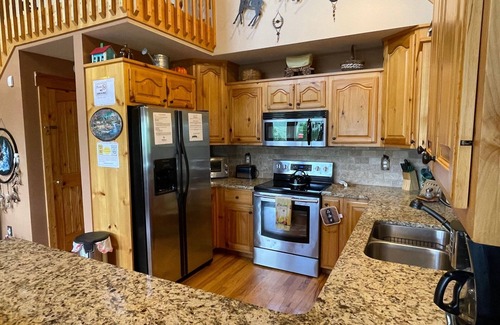 Privacy, Nature, Relaxation & Mountain Views - what more could you ask for in a mountain retreat! Nestled in the trees, tucked away in a small community - this home offers a large great room with gas fireplace, flat screen TV, comfortable furniture - so you can enjoy the mountains from the couch! Spacious kitchen with granite counters and Dining table. Main floor bedroom suite offers a King bed and a full bathroom with walk in shower. Upstairs is the master suite with King bed. Also, a full bathroom with jetted tub and walk in shower. Outside is a large wrap around deck on three sides. Gas grill, table and chairs and the perfect place to relax and enjoy the mountains. Perfect as a couple's getaway or a family looking to relax and enjoy nature!