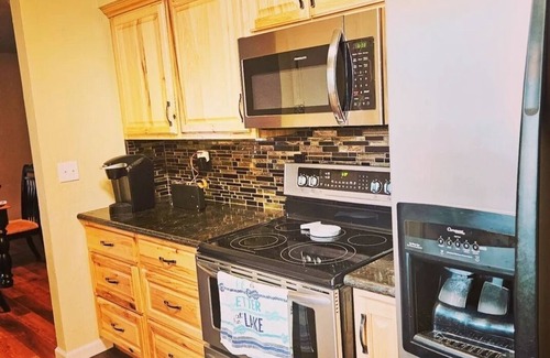 KITCHEN: Fully stocked with cooking essentials, plus toaster, Keurig, Oven, Microwave, Fridge and Freezer