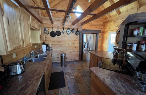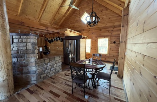The cabin has a very expansive great room, featuring an eighteen-foot cathedral ceiling and a gas fireplace. The kitchen is designed to appear as an outdoor cooking area, with granite countertops and accent lighting. A dining area features a one-of-a-kind dining table made by craftsmen who bring out the beauty in the wood. Our cabin is now equipped with up to 300Mbps fiber internet.