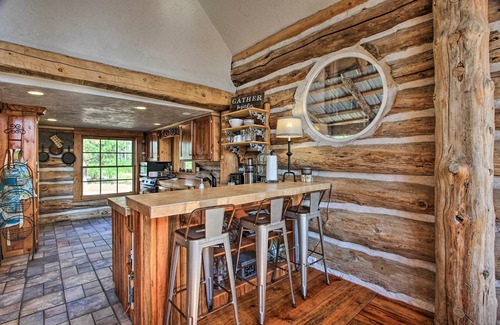 INDOOR LIVING: Spacious, log cabin interior, floor-to-ceiling windows, hardwood/tile floors, wood-burning stove (wood provided), natural light, high ceilings, laptop-friendly workspace, hardwood dining table w/ seating for 8