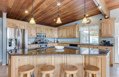 Head upstairs on the majestic log spiraling staircase and the first sight you will see is the custom kitchen. This huge gourmet kitchen gives room for everyone to gather and leaves room for the cooks to enjoy their space too! You will have everything you need to create your favorite dishes and entertain the whole crowd! Next to the kitchen is a new bar area, complete with an extra fridge.