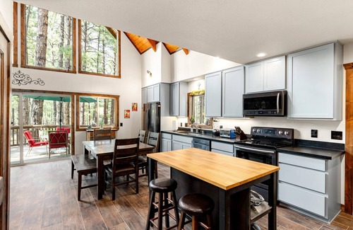Faewild's faery charm and cozy atmosphere is the ideal place to gather with friends and family. With 3 bedrooms and 2 full bathrooms, it has room for 6-8 depending on how cozy the group is. Situated on a rise in the middle of the tall pines in Sherwood Forest Estates, it sits on its own acre with beautiful forest views. This property has it all: fully equipped kitchen, gas fireplace, loft, an office area with stand/sit desk, comfortable office chair, keyboard, mouse and monitor for you when you need to do some work while at the cabin. Outside the garage is available for guests - a real plus when it's snowing! A downstairs deck with outdoor dining table and Weber grill, and whimsical touches all over the land and trees come alive with faery lights at night. Upstairs there is a deck as well with commanding views of the trees. Full sized washer and dryer, and High-speed internet plus high-def smart television round out the list of amenities. -