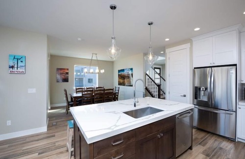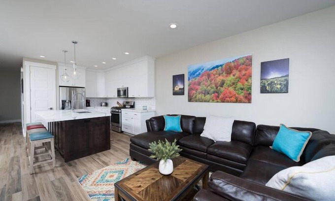 Beautiful decor, fun modern colors, and large open kitchen area. Features include a flat-screen TV's, a gas fireplace, gas grill, outdoor seating, and lovely mountain views.