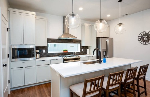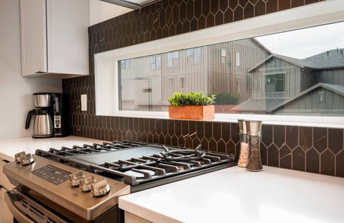 Our townhome is a haven of luxury and comfort, designed to host up to ten guests with ease. Each bedroom is a sanctuary of relaxation, adorned with high-quality linens, pillows, and towels. The interior showcases elegant plantation shutters, warm wood flooring, and subtle recessed lighting. The living space, illuminated by natural light and mountain views, features a large smart TV and deluxe seating in an inviting open layout. The dining area comfortably seats eight, with additional space for four at the kitchen island. Culinary enthusiasts will delight in the fully equipped kitchen, boasting modern appliances, a gas stove, a spacious quartz island, a large fridge, and all the essentials for crafting gourmet dishes.
