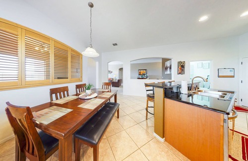 This home offers guests an open, spacious floor plan. The large family room and den/bonus room, both complete with comfortable seating and TVs, will provide personal space for families, golf buddies, or couples who need their own space after a day of recreation or sightseeing together. Settle in and enjoy mountain and desert views from the gorgeous sparkling private pool! Everything is designed for comfort in this lovely home. When you're done exploring, come back to central air conditioning and a reclining chair by the pool. For those wanting to host a family gathering or group of friends, the spacious kitchen and dining seating will prove to be quite useful. A gas grill and patio table set make for a relaxing and casual place to enjoy outdoor dining surrounded by scenery only the desert can offer. Four bedrooms offer comfortable beds and TVs in three of the four rooms.