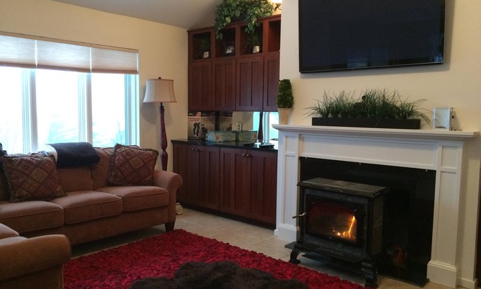 Two bedrooms & two full baths, sleeps 7. Master bedroom has a king size bed with a new mattress. Second bedroom has a queen size bunk bed with pull-out twin size trundle; additional air mattress, and cot. Enjoy the Hearthstone free standing wood burning stove that gives off plenty of warmth and makes for a cozy environment. 60 inch cable mounted TV with Blu-ray player connected to Bose speakers.