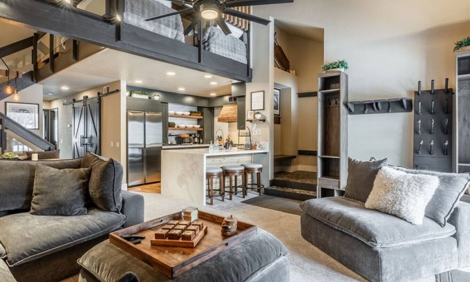 Ideal for families, Snowcreek IV comfortably sleeps up to 10 guests between two full bedrooms on the lower level, and a large open loft above the living area. The main floor large master suite features a king-sized bed, picture window, en-suite bathroom, ceiling fan, and 65-inch Smart TV. The neighboring primary room has a king-sized bed, hall access to a full bathroom, ceiling fan, and 65-inch Smart TV. A private washer and dryer on this floor to add to your convenience, keeping you ready for year-round adventures, from skiing to mountain biking. The upper floor spacious loft ideal for singles, couples or kids, has a twin-over-queen bunk bed, two twin beds, and an additional trundle with a total sleeping capacity of six with a huge en-suite bathroom, along with a 65-inch Smart TV, Arcade 1Up Pac Man Video game and ceiling fan.