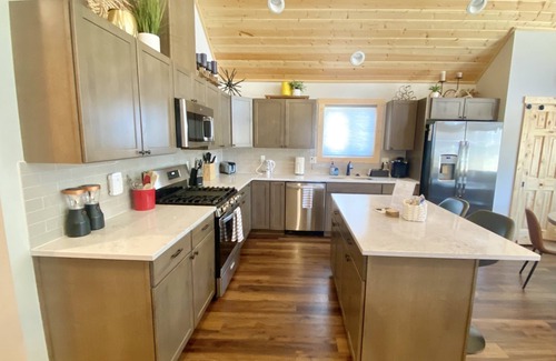 Step into an immaculate new cabin with an open-concept floor plan, soaring cedar ceilings, and a majestic floor-to-ceiling rock fireplace. Our spacious, fully stocked kitchen and great room are perfect for entertaining. The main bedroom features a king-sized bed and a private full bathroom, ensuring your comfort and privacy. The guest room, with a ¾ bath and laundry closet, is located on the main floor.