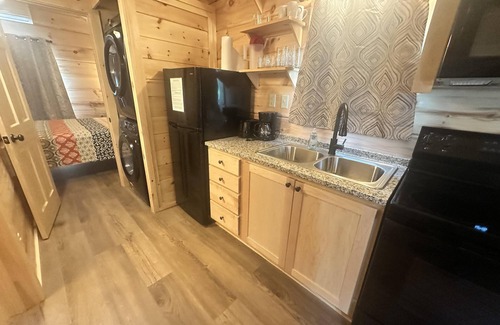 The Hunky Dory cabin has log decor throughout. There is a couch in the living room along with end tables. The bedroom has a King bed with cotton quilt. Cell phone service is Great and the WiFi is super fast in this cabin.Most guest are able to use WiFi calling also while at this cabin. The private, covered porch has a hot tub, gas grill, two chairs, and a table. This cabin overlooks a pond in the winter time and has a wooded view in the summer time.. This cabin is pet friendly!!! The Hunky Dory cabin is just perfect