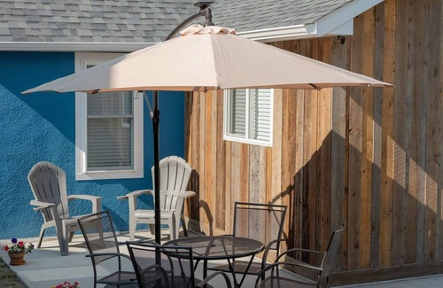 Outside, a concrete patio beckons with a table, chairs, cantilevered awning, and Adirondack chairs complete with cup, key, and phone holders. A propane grill is also at your disposal.