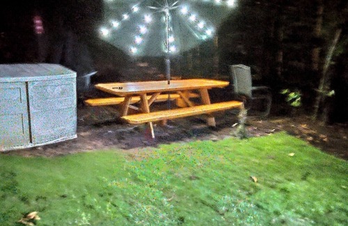 A picnic table with umbrella (the inside lights at night, like stars), a firepit (30 pieces of firewood are provided), a gas grill with a smoker (chips are provided, just ask) can also be powered with charcoal.