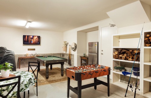Separate games room in garage with large smart TV, table and chairs, fridge/freezer, pool table, rustic table tennis table, foosball table.