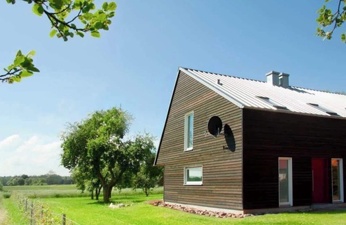 The Solar-Ligna eco vacation cottage offers over 90 m² of living space on a 5000 m² plot of land with old fruit trees, which can be used free of charge. The vacation home has two bedrooms, a kitchen and a living area with a wood-burning stove. The bathroom of the vacation home has a shower. There is also a further guest WC. The flooring is predominantly linoleum and the vacation home is heated by infrared radiators or via the wood-burning stove.