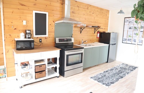 Our rental is fully solar powered so you can enjoy an eco-conscious stay. Inside the rental, you'll find a comfortable living area with a flat-screen TV, perfect for relaxing after a long day of exploring or work. There is also a fully equipped kitchen, allowing you to prepare your favorite meals during your stay. The desk is spacious and sturdy and easily accommodates two people working from home.