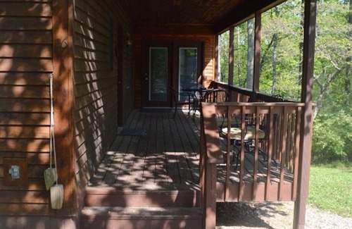 Cabin has a covered deck with a picnic table and a private fire ring.