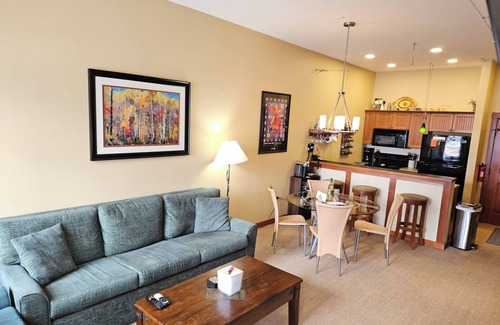 Only a few steps away from ski lifts and swimming pool. This Condo has a beautiful living space with 2 large sofas in living room. One is a new, very comfortable king sleeper sofa (no bars), tempur-pedic mattress. OLED flat screen TV and custom-built alder wood armoire in living room.