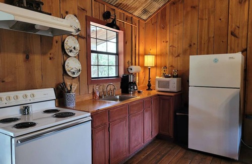 The "bedroom" is located up on a two step platform area which overlooks the living area and fireplace. A few feet to the right of the bed, the double whirlpool bathtub is sunken into the floor (no shower). The kitchenette offers a full size stove and refrigerator, microwave, coffee maker, pots, pans and dishes. Coffee, tea, sugar, creamer, trash bags, paper towels and dish soap are provided.