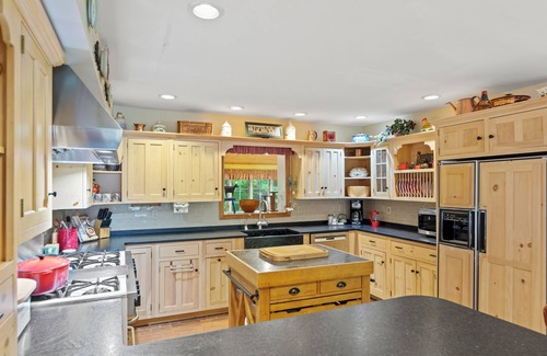 Bright and cozy, lovingly maintained, barn style family home. Ideal for entertaining family and friends. Open concept main area with wide planked hardwood floors, dining and living room with large stone fireplace. Spacious and well equipped kitchen with Five Star 60" commercial gas range, prep island, granite countertops, soapstone farm sink. Large TV room perfect for gathering to watch games and movies. Arranged spaces for reading, playing cards or board games. Cozy first floor bedroom connects to renovated full bath. Top floor has a master suite with King bed, TV, shower and jacuzzi tub, queen bedroom with flat screen TV and a twin guest room. Full bath in main hall. Finished basement includes 2-1/2 bedrooms and a flex room with 5 beds total recently renovated full bath, game room with vintage pool table, TV, bar and multiple plush leather couches. Fully equipped gym with treadmill, elliptical, concept rowing machine , TV and yoga mats. New 8 person, outdoor hot tub. Full laundry room.