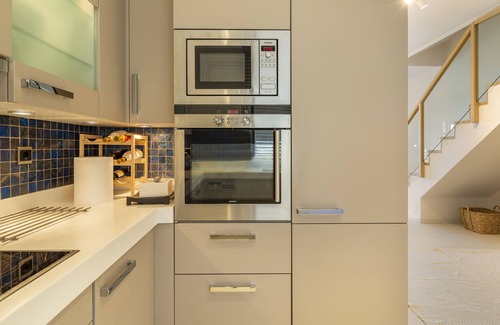The lower floor of the house is an independent studio with its own entrance. It is connected to the rest of the house via the internal elevator. It's a single open space with a sitting area, two sofas (one sofa-bed). It has a large, fully equipped utility kitchen with a dishwasher that serves the home's outdoor BBQ. This space also has a bathroom with a built-in shower and and a washing machine.