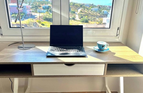 The main entrance to the house is on the first floor. This floor has an open layout with a fully equipped main kitchen, a dining table and a large living room with a comfortable sofa, smart TV & Xbox . The first floor has a balcony with a view of the neighborhood, the olive groves and the northern Evia island.