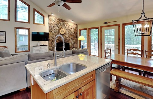 The main level sets the scene with an open living, kitchen, and dining area. A large sectional invites you to relax by the crackling wood-burning fireplace or stream a movie on the Smart TV. Step out onto the deck, where lake views stretch before you and outdoor dining and lounge seating create the perfect setting for morning coffee or sunset dinners. The fully equipped kitchen, complete with an island and barstool seating, makes meal prep a breeze, while the dining table ensures everyone has a seat.