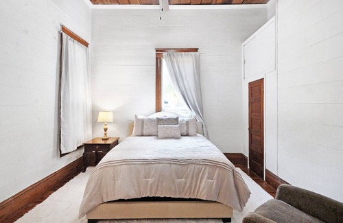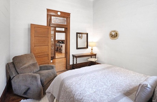 Fall in love with such architectural details as the ornate double-door entry and operating window transoms above the five- and seven-foot windows. Be awed by the wood floors, walls, and soaring 12-foot ceilings. All four bedrooms are furnished with queen- or king-size beds, sofas or comfy chairs, and writing desks or make-up tables. Two baths and a half-bath are set up with extra amenities should you need them.