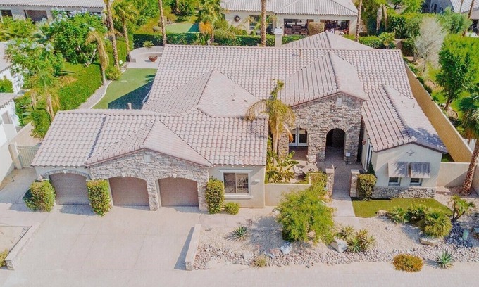 The floor plan encompasses five spacious bedrooms with plenty of room for study, sleep and storage. Five luxurious bathrooms, stocked with fresh linens and towels. The large master bedroom has plenty of space where you can enjoy the view, a private back yard entrance, large walk in closet, jetted tub to relax and a beautiful large private bathroom. Two of the five bedrooms are two private entrance casita's (small suites) that attach to the house in the main entrance courtyard. Every bedroom and family space has its own TV with all the cable channels to enjoy during down time. The kitchen is sleek and stylish. It flows through to the dining room and private rear patio. This home has plenty of room for all with over 3600 plus square feet of living space. You will have space to spread out with the use of the game room, formal dining room, large family room attached to the chef kitchen and a fabulously large back yard. The home is very family friendly. We have games for all, two new cruiser bikes, floats for the pool, yard games, and of course a fire pit to roast s'mores! And to give you peace of mind, the home sits with in a secure gated upscale community of Montage Estates. The outdoor living space is absolutely amazing! Beyond the glass, is a paradise outside that sits among the palms. The yard is fabulously manicured. You can enjoy the outdoors for hours with the two fire pits, outdoor kitchen, outdoor fireplace, TV, bar, large side yard and plenty of seating for all. You can relax by the private heated pool and a lovely waterfall spa. This house is perfect for a family vacation, a holiday retreat, or a get away with friends. This home is ideally positioned to enjoy the proximity to cafes, restaurants, casinos, entertainment and shopping centers. And we are walking distance to the festivals (Coachella and Stagecoach) and a 10 minute drive to the tennis tournaments! The home has plenty of parking for you and your guest with a three car garage and a drive way that fits an additional three cars. It's the perfect home away from home. You and your guest won't want to leave!