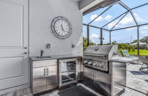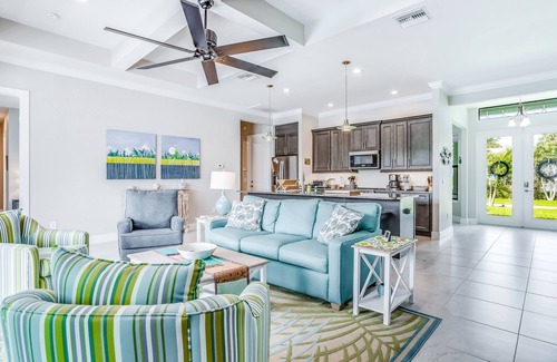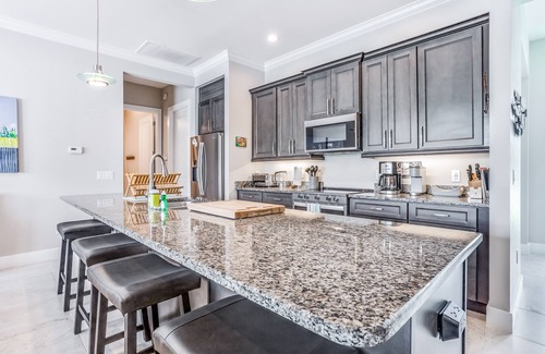 Decorated with beachy touches throughout, this home is ready to be your fun vacation retreat! The private saltwater pool with lanai is perfect for a dip or two. Or, grab your favorite book and relax on the lounge chairs or hammock for added leisure. Enjoy cooking in the full kitchen, equipped with luxuries like a French door refrigerator and kitchen island, then store your wine and snacks in the outdoor kitchen for easy-to-grab refreshments. Cooking on the private gas grill is always an option, of course. Central air-conditioning and a ceiling fan in every bedroom will keep every guest comfortable. There's also a TV in every bedroom so everyone can wind down with their favorite shows. If someone has remote work or homework to finish, there's a workspace in the main bedroom - the high-speed internet is perfect for your needs. Board games are included for long nights winding down by the pool.