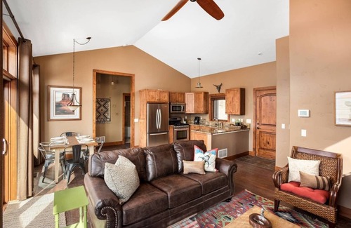Step into a welcoming open-concept space with vaulted ceilings and a cozy stone fireplace (electric insert). The living room is designed for connection — a movie night on the plush sleeper sofa, a round of cards at the dining table, or a glass of wine as the sun dips behind the peaks. The fully equipped kitchen features granite countertops, a gas range, oven, dishwasher, and all the essentials to prepare everything from hearty breakfasts to après-hike dinners.