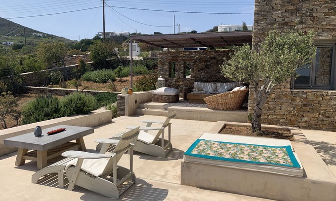 Perfectly located, spacious stone villa built with traditional materials creating a modern yet cozy summer house ideal for relaxation. This newly constructed beautiful villa is a 3 minute walk from Soros beach, enjoys magnificent views of the Aegean islands and is perfectly suited for families or groups of friends.