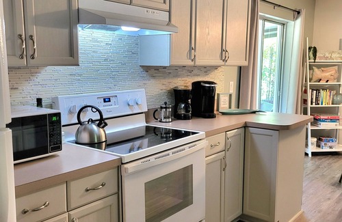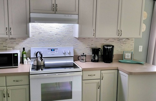 The kitchen has what you need if you desire to cook. French Press, Drip, and Keurig are available with complimentary Kcups, creamer. sweetness for your coffee. Free washer & dryer are conveniently just off the kitchen, inside AC.