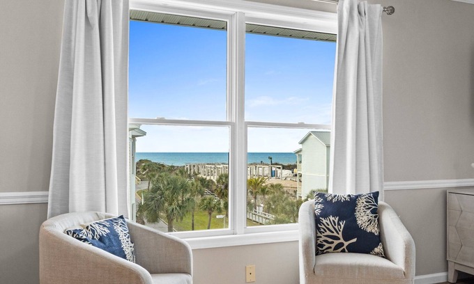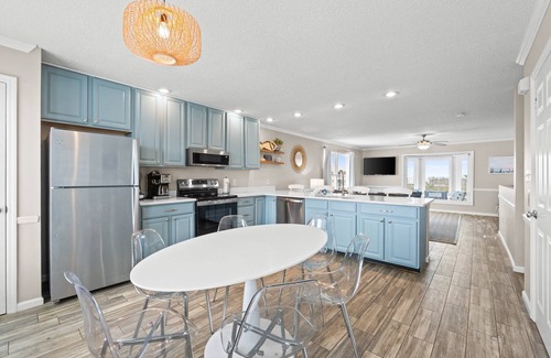 The top floor features the living room, dining room, kitchen, and 1/2 bath. The open floor plan is great for large groups. Enjoy direct ocean views from the living room window as well as off the balcony. When it’s time to come in from the beach, enjoy a great selection of puzzles and games too!