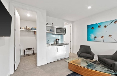 Welcome to our modern studio in Scottsdale, an ideal retreat for travelers seeking both comfort and convenience. This stylishly furnished studio features a comfortable queen-sized bed, a sitting area with plush chairs, a smart TV, and high-speed Wi-Fi to keep you connected. The kitchenette is equipped with modern appliances, including a microwave, stove top, and a refrigerator. Perfect for preparing light meals and snacks. Step outside onto the private patio, complete with outdoor seating to enjoy the beautiful Arizona weather.