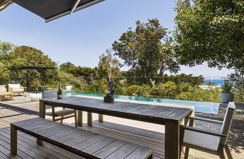 Entry to the house is via a long tree lined driveway which has parking for 4 cars. Up a flight of stairs, you are immediately greeted with a large infinity mineral pool and spa overlooking the front garden which also features bay views. Lower deck of pool has a Sauna, outdoor shower and BBQ with bar fridge and sink.