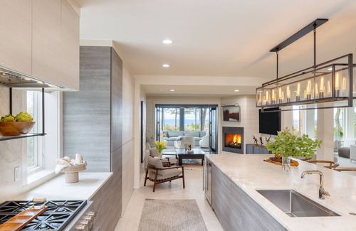 Inside, the main living area is a vision of openness and light, with floor-to-ceiling windows framing the beauty of the sea. Vaulted ceilings enhance the airy ambiance, while comfortable sofas in the living room, bench seating in the dining area, and barstool seating in the chef's kitchen create spaces for connection and culinary delights.