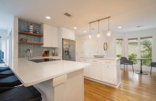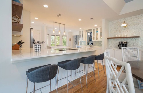 Modern Kitchen: The professionally designed kitchen boasts quartz countertops and a large convection oven/range, making it easy to cater for your wedding party or host pre-wedding meals. With a breakfast nook and ample counter seating, this space is both functional and inviting.