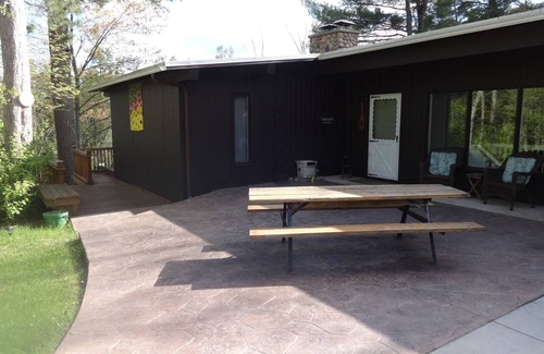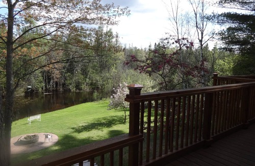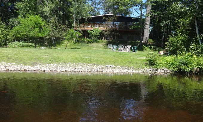 Roomy house on the south branch of the Ausable River. Comfortably sleeps 8. Large deck overlooks the river. Fireplace in the living room, 2 car garage and 3 car garage, fire pit on the riverbank. Trout fishing and canoeing. This house is upstream of all the canoe liveries. the mason tract, (flies only water), starts 4 miles downstream. State ski/ hiking trail starts at the end of the road, (⅛ mile) . Groomed for classical and skating.