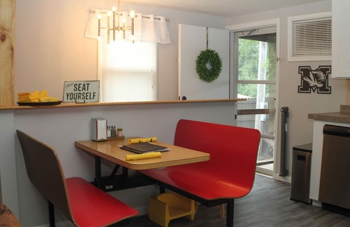 Unique kitchen and living/dining room for 8 guests with a bar/restaurant theme including 2 high top tables and a booth. Downstairs has lounge with ping pong and cabinet video game with hundreds of titles. Out back there’s a screened deck with table and chairs (seats 6). Or try the lower deck with furniture and grill. Or head over to the lighted firepit area which has room for everyone, plus a picnic table.