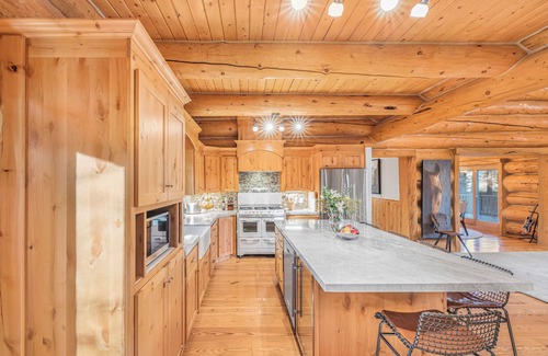 The cabin has a large, fully-stocked kitchen, ideal for meal prep and entertaining. Outside, enjoy the private pond and a gazebo complete with a fireplace, perfect for unwinding after a day of exploring with a cup of hot chocolate and smoores.