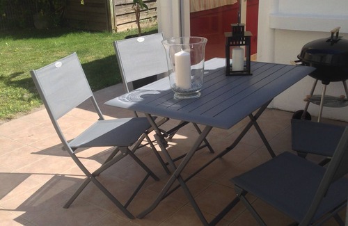 Terrace equipped with garden furniture, deck chairs and barbecue, enclosed garden.