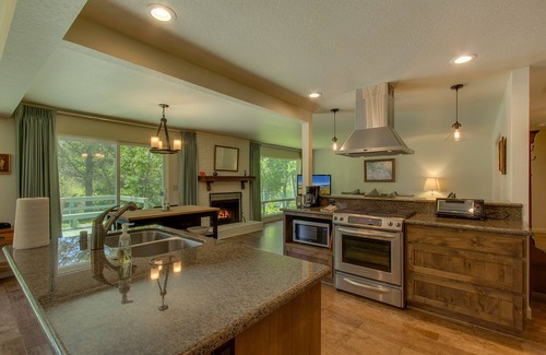 The kitchen, with granite countertops, new appliances, and cabinets, sits in the middle of the main living making it command central. The living area has plush sofas, loveseats, gas fireplace and a flat screen TV. The deck has a brand new Weber BBQ and gorgeous views. The house has new hardwood floors, carpet in the bedrooms, renovated bathrooms, and new furnishings.