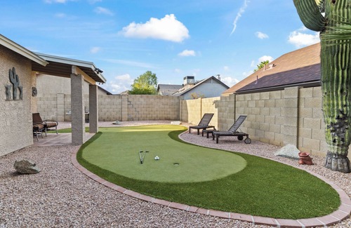Wonderful vacation rental for all travelers looking to enjoy everything the greater Phoenix area has to offer. This 2-bedroom 2-bathroom split floor plan home is located in a quiet neighborhood that is just15-20 minutes from downtown Phoenix, Tempe, Scottsdale and Chandler. The home offers an open kitchen/living room layout with a full set of amenities to ensure an enjoyable stay. Take in the mountain views while enjoying the 3 hole putting green!