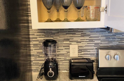 Features beautiful kitchen with dining area, 2 bedrooms with queen beds & fine linen of goose down pillows and comforters, 2 and 1/2 bath for maximum of 4 guests in a quiet upscale neighborhood.