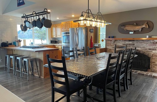 The house has many options for dining. Just off the kitchen, we have a large table that seats 8 people comfortably. There is also a smaller table near the slider door to the waterfront deck that seats 4. In addition, we have a highchair and youth chair. Outside, we have a dining table that seats 8, two lounger chairs for sun-bathing relaxing or napping, as well as two outdoor love seats with two chairs with a gas fire-pit coffee table. Also, a fire pit with 4 Adirondack chairs, two bench seats and plenty of firewood. Lots of comfortable places to eat, socialize, or just sit back and enjoy the gorgeous view.