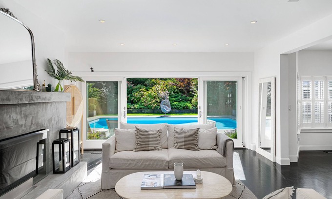 Downstairs Living Room with Fireplace onlooking the private pool (perfect setting for fireside hors d'oeuvres and cocktails)