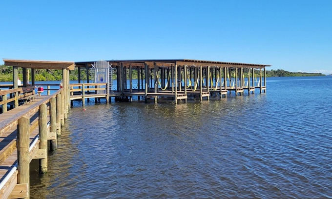 Escape the crowds and bask in the beauty of Florida's Intracoastal Waterway, where dolphins dance and manatees play. Only 15-20 minutes from New Smyrna's renowned drive-on beach, our retreat is located across the waterway from Canaveral National Seashore, a beautiful nature preserve, prime for kayaking in the backwaters. Enjoy world class fishing in the ever popular and nearby Mosquito Lagoon or relax on the pier for bird watching, pier fishing, or just marveling at the beauty and wildlife of the area. Guests are often happy to report that they were able to witness one of the Kennedy Space Center shuttle launches right from the same pier!