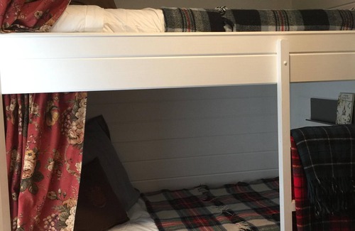 The first level includes the living room with a flat-screen TV, dining room, bunk room with a flat-screen TV, bathroom, and Kitchen. The vaulted ceiling in the living room looks up to the cozy sleeping loft furnished with a queen bed, a flat-screen TV. You will find a full-size washer/dryer behind a hand-crafted sliding barn door on the second floor.
