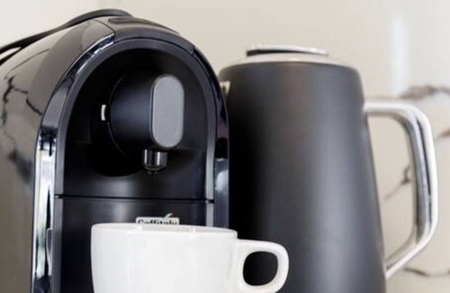 The apartment features an open-plan living and dining area with a wall-mounted flat-screen TV—perfect for movie nights or relaxing with friends and family. The living area also includes a sofa nook by the window, ideal for reading or taking in the neighborhood scenery. The fully equipped kitchen includes modern appliances and a coffee maker, making it easy to cook your favorite meals. A cozy dining area completes the space for relaxed meals.