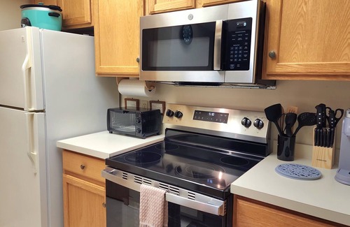 The condo features a comfortable living room with a gas fireplace, ideal for relaxing with family or friends. The fully equipped kitchen boasts modern appliances, perfect for preparing meals between skiing excursions.